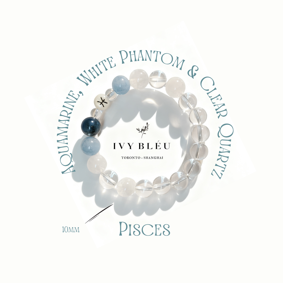 The Pisces-inspired bracelet combines 10mm Aquamarine, White Phantom Quartz, and Clear Quartz for a clean, serene look.