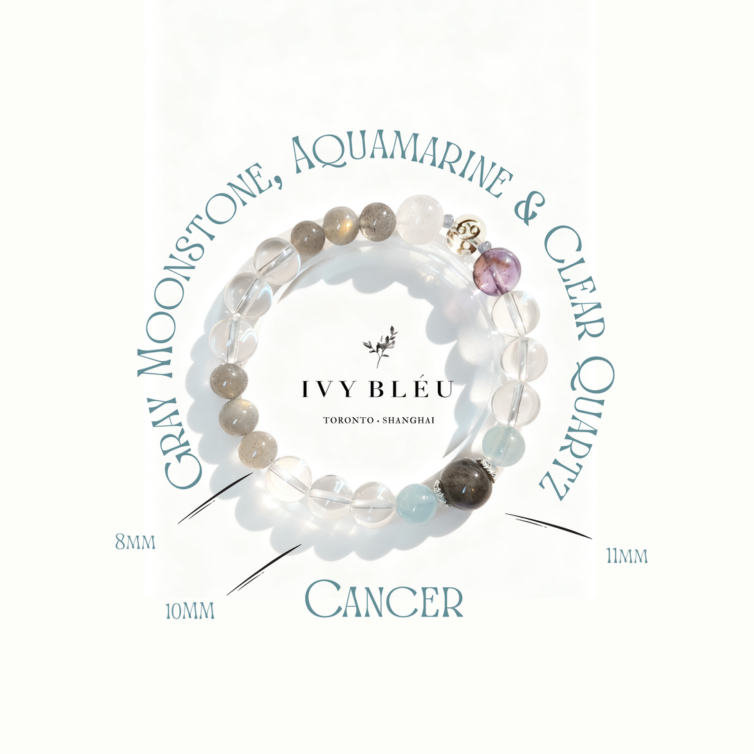 The Cancer-inspired bracelet features a calm blend of 8mm Gray Moonstone, 8mm Aquamarine, an 11mm Moonstone center bead, and 10mm Clear Quartz.