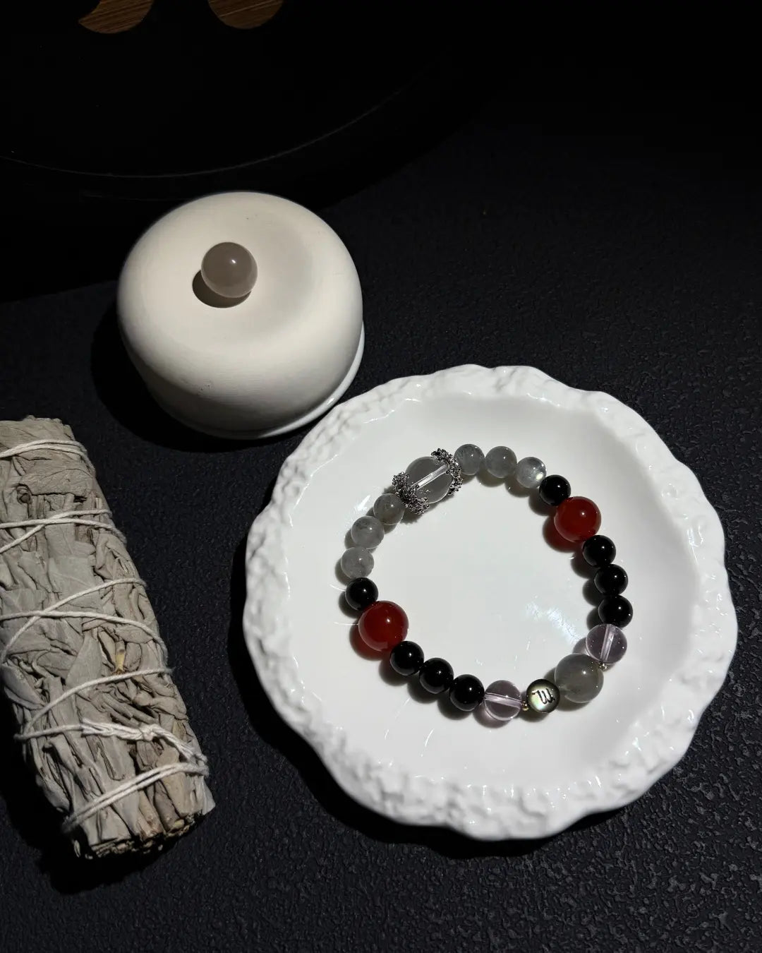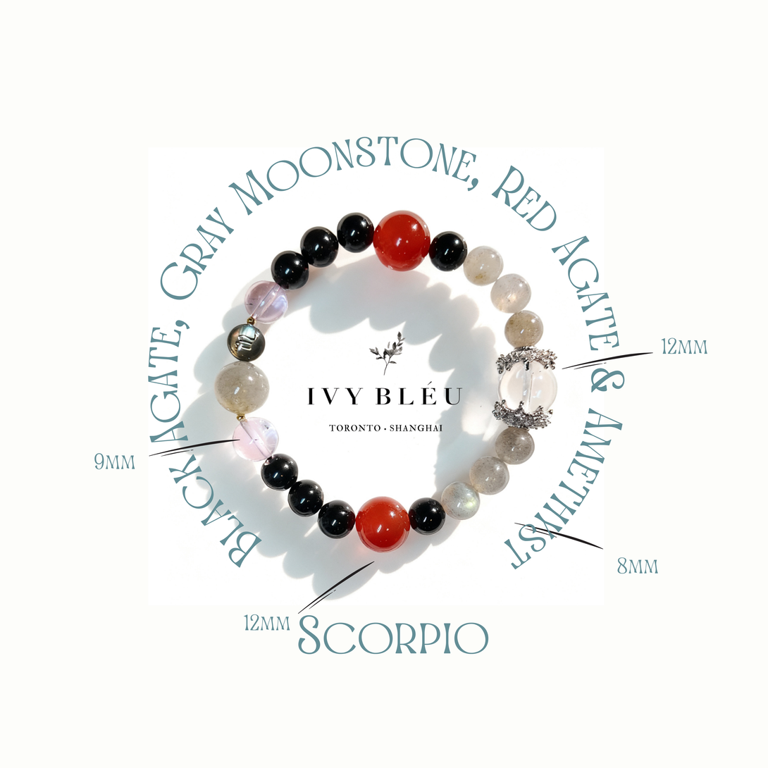 With 8mm Black Agate, 8mm Gray Moonstone, a bold 12mm Red Agate, 9mm Amethyst, and Clear Quartz accents, this design embodies Scorpio’s symbolic contrast between intensity and calmness — expressed through color and texture only.