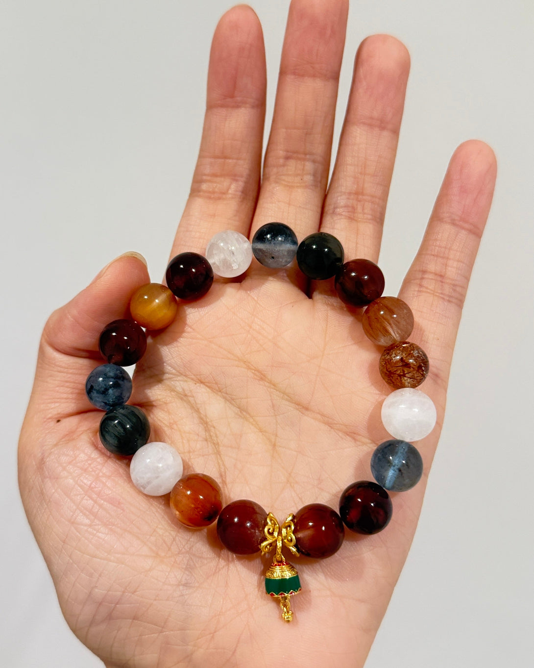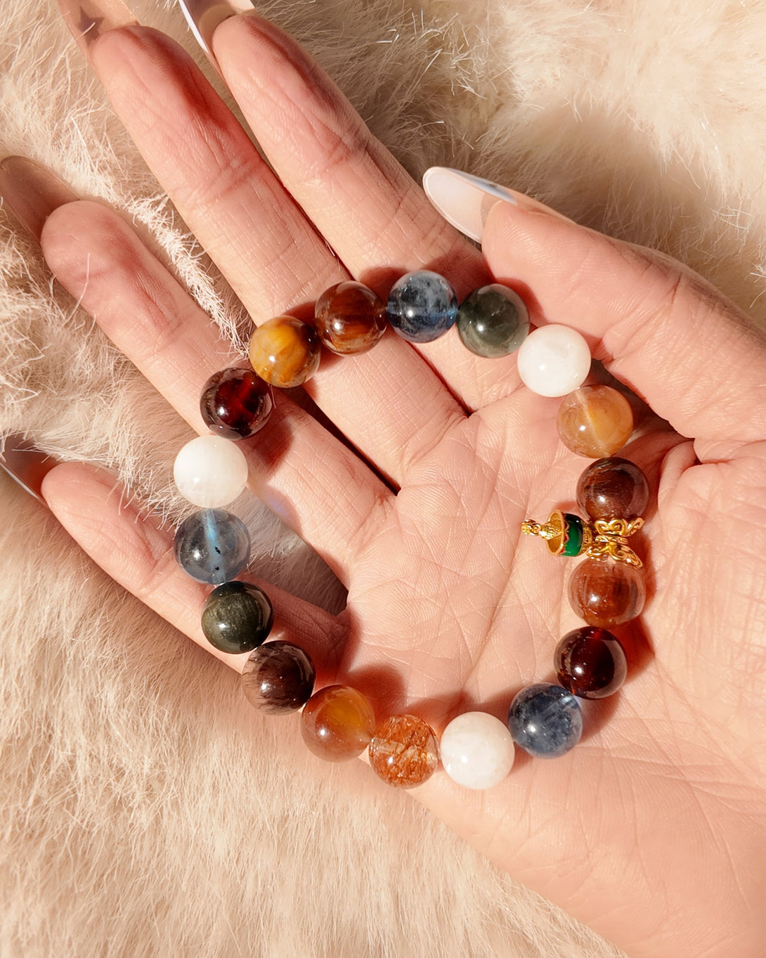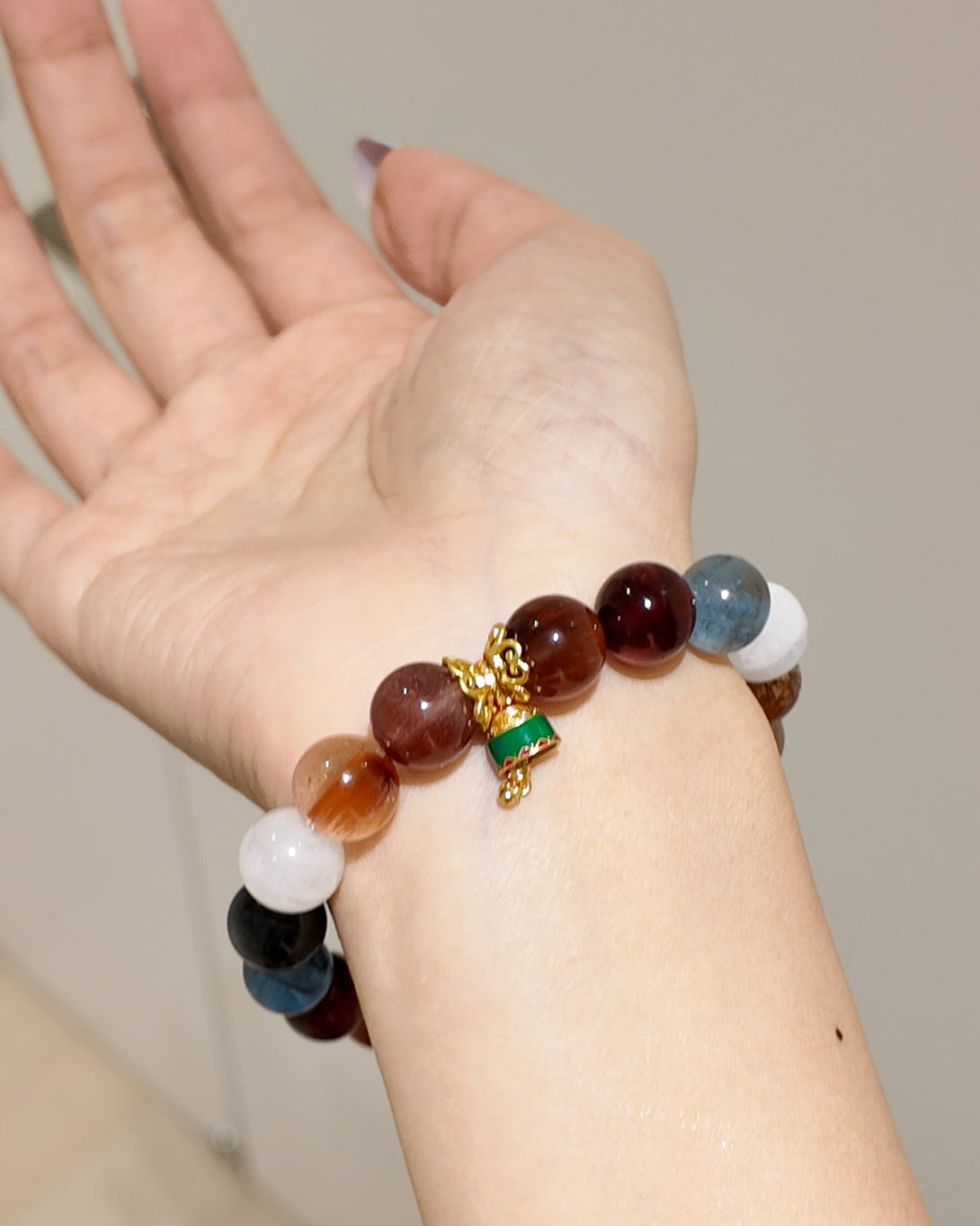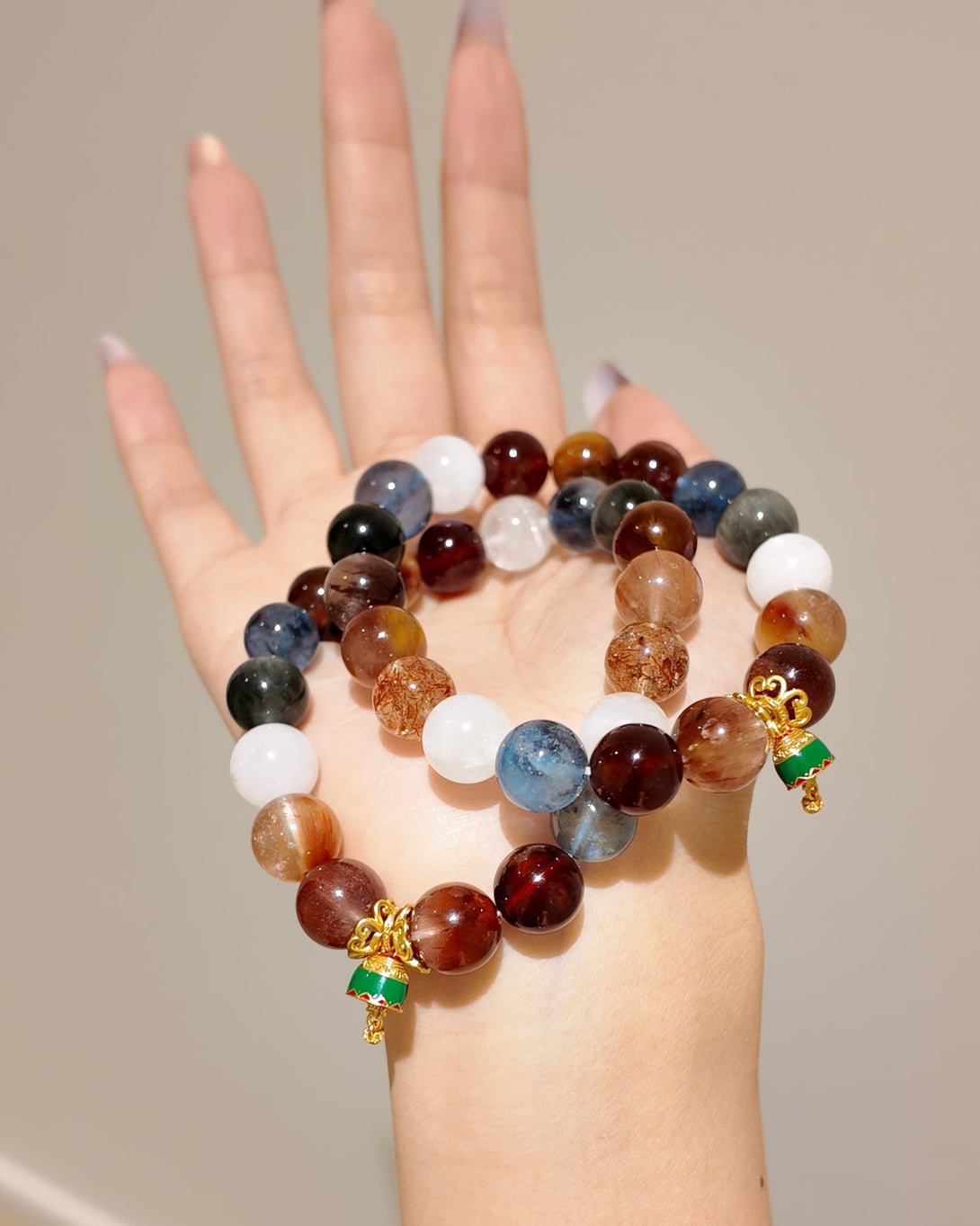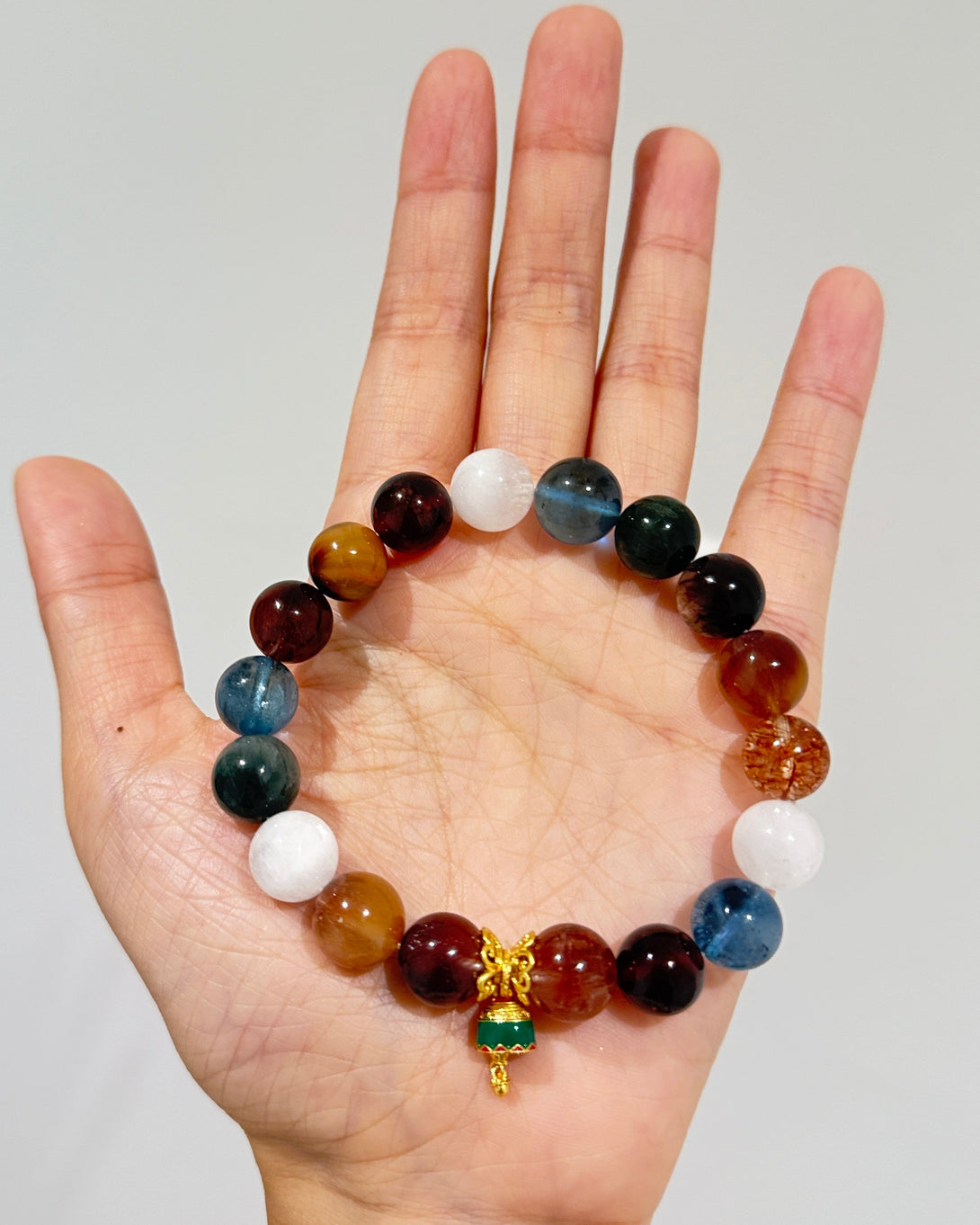 The Christmas Wishlight Bracelet features a winter-inspired palette of 11mm White Phantom, 11mm Aquamarine, and 11mm Rutilated Quartz, accented with 10mm Garnet and 10mm Black-Gold Super Seven for a soft, festive glow.